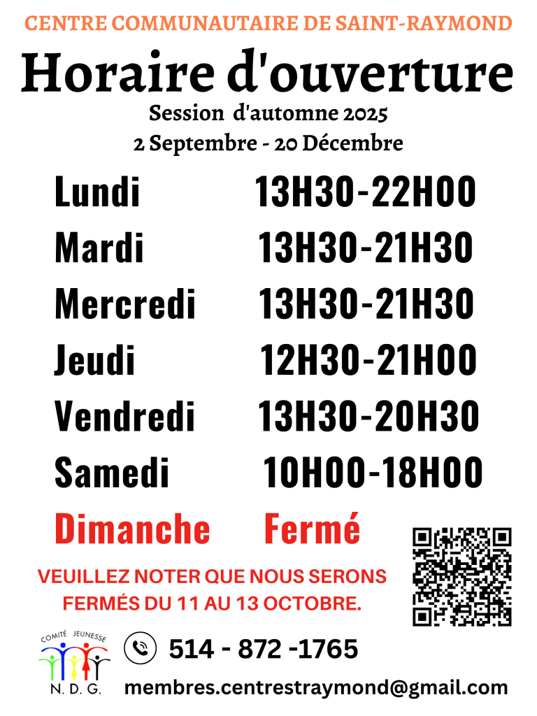 Le Centre communautaire Saint-Raymond est géré par un organisme sans but lucratif appelé le Comité Jeunesse NDG. Nous avons un comité consultatif en place qui est constitué de 6 consultants locaux et de 3 consultants institutionnels. Nous sommes aussi en partenariat avec la Ville de Montréal.